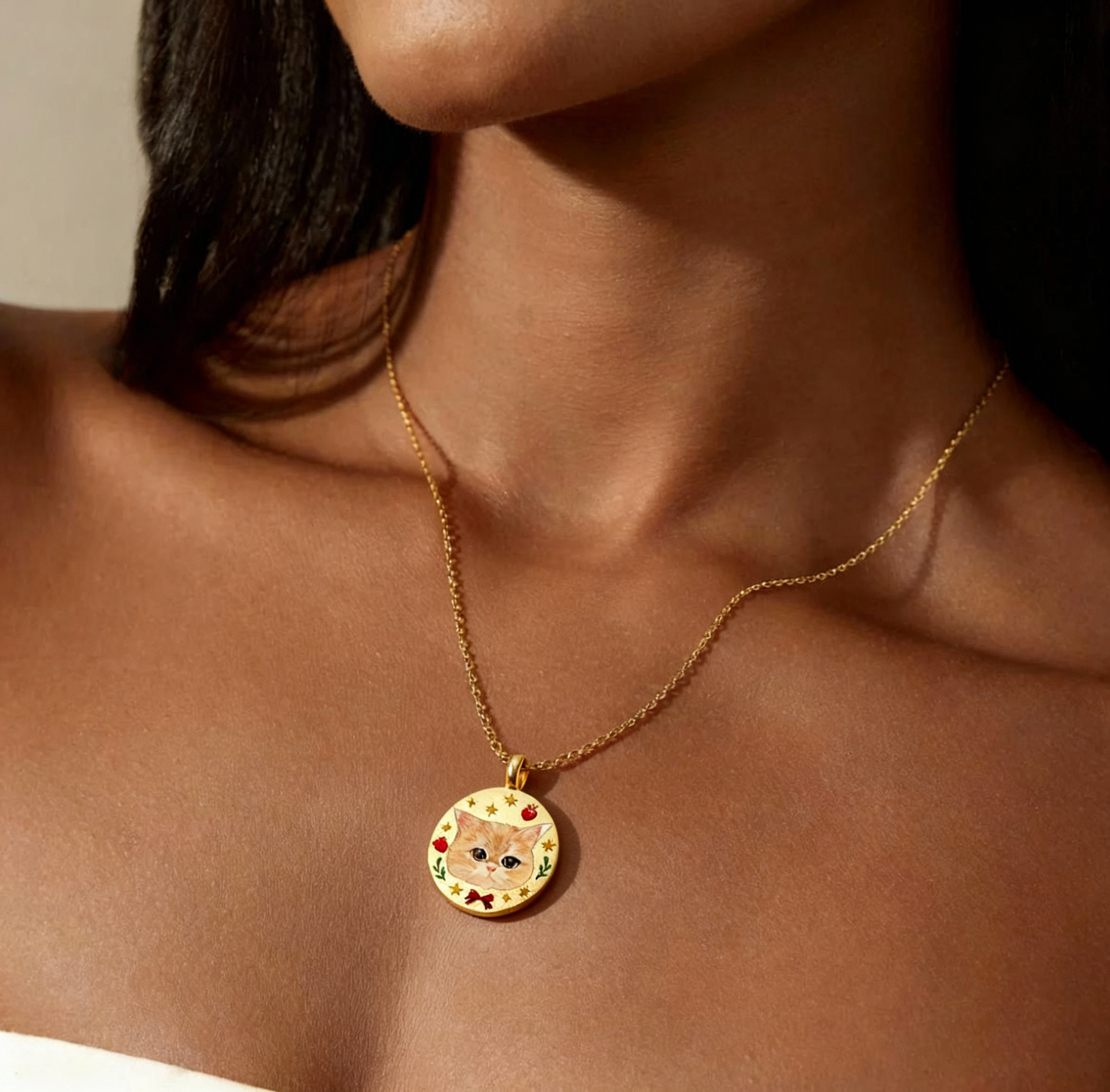 The Gilded Portrait Medal is a timeless emblem of your bond. Crafted from a single piece of gold-toned metal, this solid pendant features a vibrant, hand-painted enamel portrait of your beloved companion. Designed to be worn close to the heart, it is a permanent and honorable way to carry their light with you, every day.