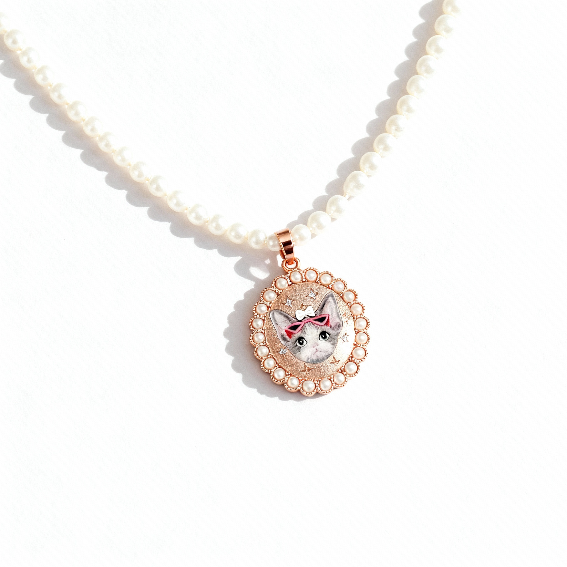Crafted from warm rose gold, the pendant is lovingly encircled by a strand of cultured pearls, symbolizing purity and an eternal, soft glow. At its center lies a hand-painted, high-fire enamel portrait, meticulously created from your photograph to capture the unique soul and spark of your beloved pet.