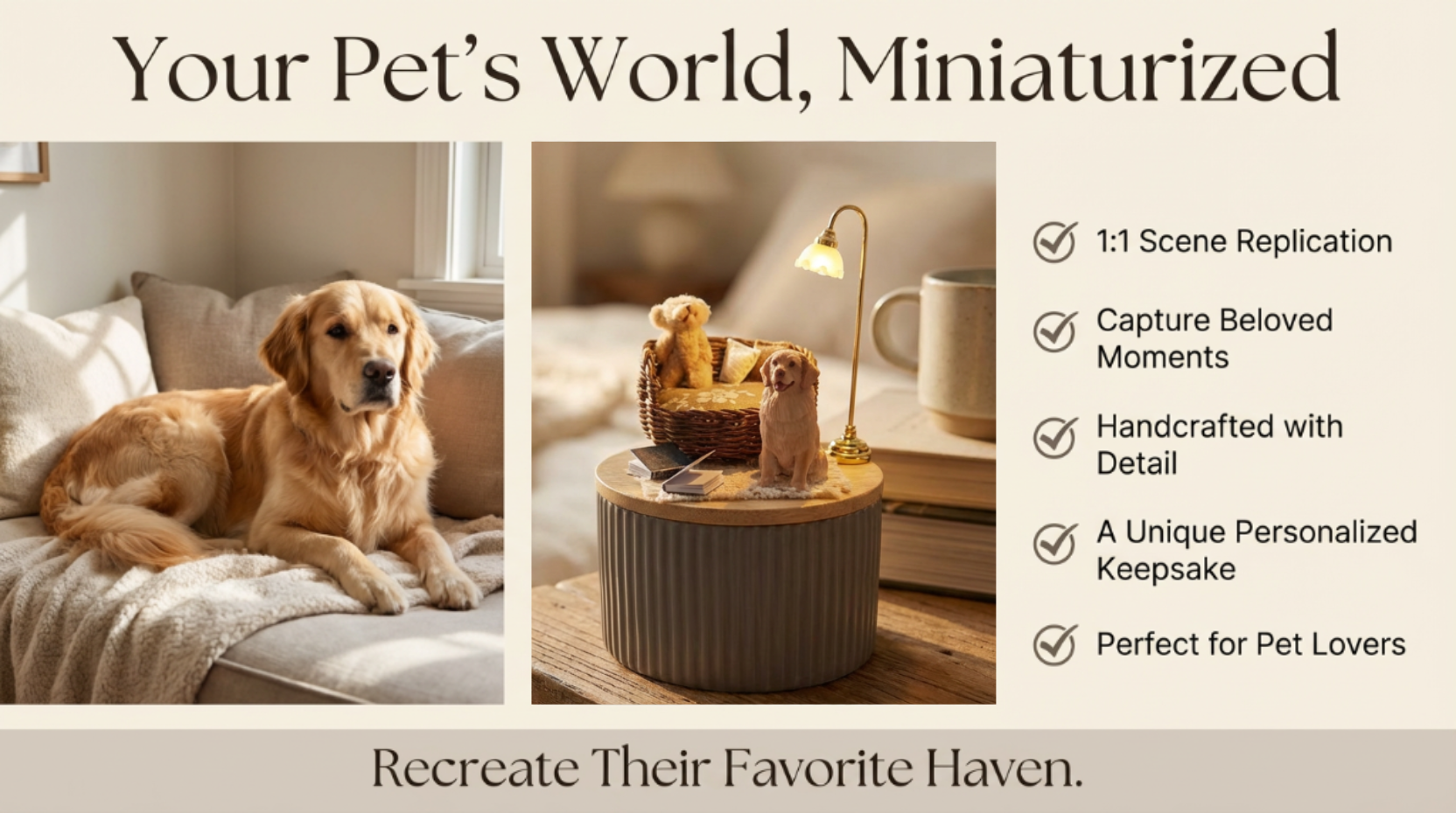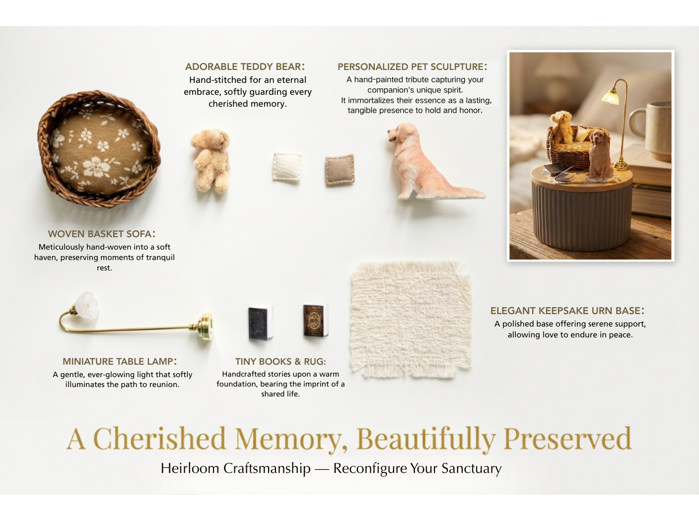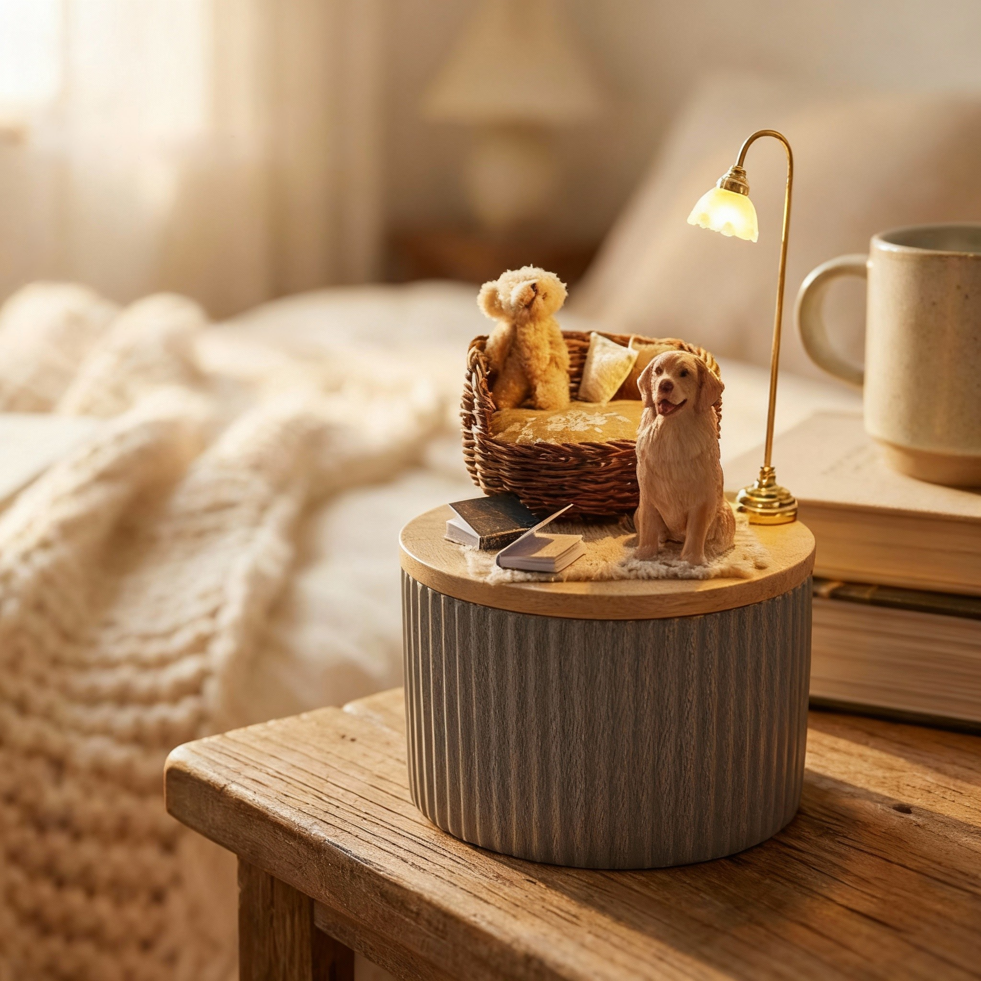 A 1:1 miniature world, forever preserving the exact corner where your companion felt most at peace. This ultimate personalized tribute features a hand-painted portrait, cherished toys like a tiny teddy bear, a glowing lamp, and other details from your photos—all set in a serene, hand-assembled scene. More than a memorial, it’s a tangible piece of your shared story, an heirloom where daily joy is lovingly frozen in time.